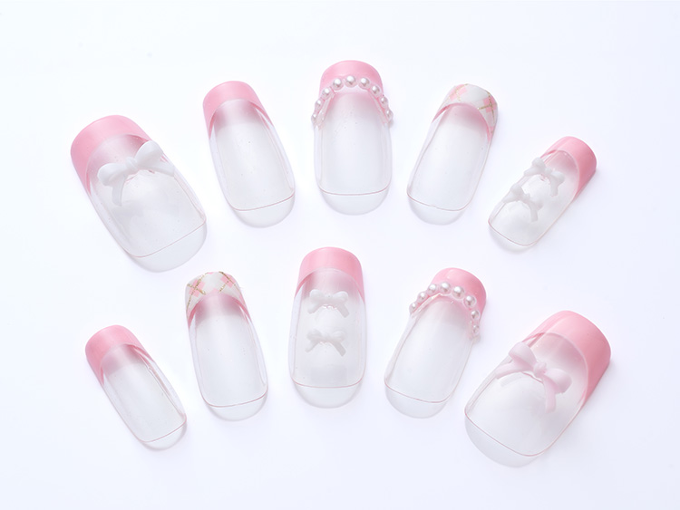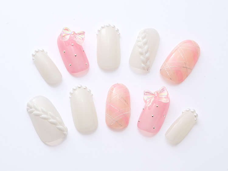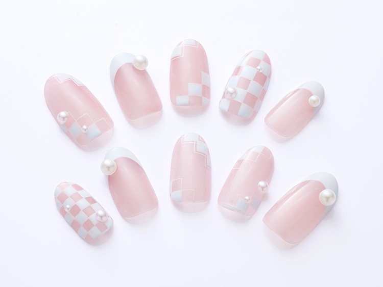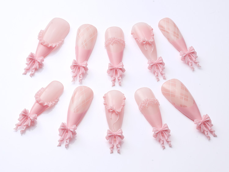 ヌーディーカラーのピンクと、10本先端をリボンにして、チップならではの遊びを入れてみました。最近気になっている先の尖っているスティレットの形にしてもらいました。ピンクの同系色で柔らかいチェックを入れて、繋がりや優しさを表現しました。定期検診は私も行くように心がけています。美しくいるためには健康が第一だと、日々実感しています。全ての女性が健康で、いつまでも好きなネイルをして幸せに暮らせますように⸝⸝⸝♡