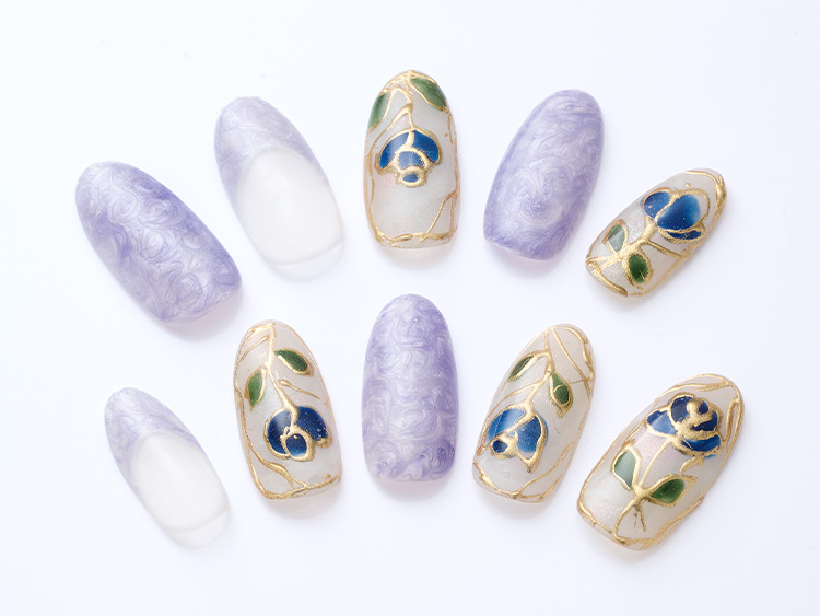 大好きな「青い薔薇」をメインにデザインしました。花言葉は「夢叶う」「奇跡」。どんな時でも希望を持ち、前向きな気持ちになれるよう願いを込めています。花を自分に向けたのは、自分自身にも花を贈ってほしいという想いからです。人は一人では生きていけないからこそ、誰かと手を取り合い、手を繋ぐ姿をイメージして描きました。僕は夢が叶い、OCTPATHというグループに出会えた喜びを胸に、グループカラーである白と紫を花に見立て、これからもファンの皆さまと共に歩んでいけますようにと願いを込めています。そして、このネイルをご覧くださった方にとっても「あなたに出逢えて本当に良かった」と誰かに伝えたくなるきっかけになれば幸いです。